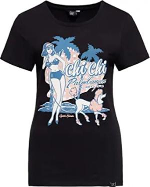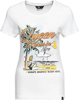Damen Print T-Shirt Vintage Shirt Slim Fit Frontprint Kurzarm Retro Hawaii Waikiki Pin-Up 50S Queens Bay
