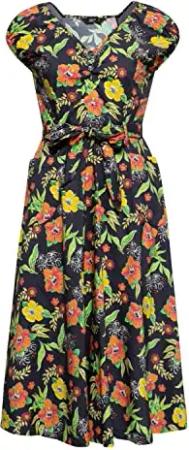 Damen Swing Kleid Tropischer All-Over-Print Sommerkleid Hibiskus 50S 40S 60S Tropical Vintage Rockabilly Rockabella Hibiskus Black