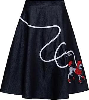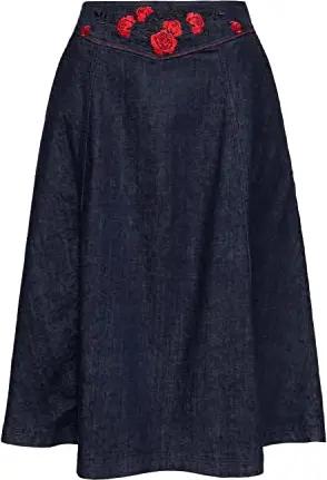 Damen Swingrock Jeansrock Denimrock Western Stickerei Rosen Denim 50S Vintage Cowgirl Roses