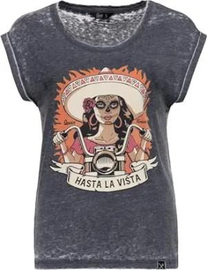 Damen T-Shirt · Top · Printshirt · Washed · Enzym Wash · Mit Roll-up-Sleeves · Kurzarm · Biker · Rocker · Mexican Style · Skull · Motorrad · Vintage · Used Look · Retro · Hasta La Vista