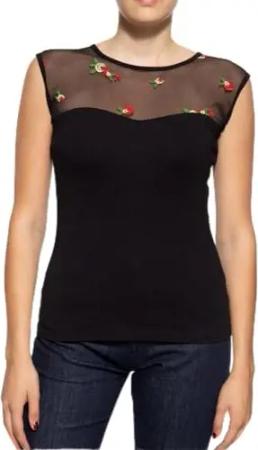 Damen Vintage Top T-Shirt Mesh Optik Rosen Stickerei Kurzarm Top Shirt 50´S Roses
