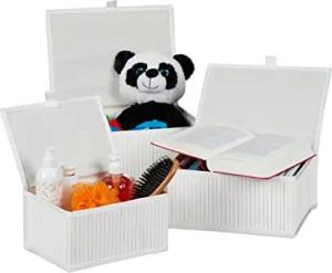 12 x Aufbewahrungskorb, mit Deckel & Stoffeinsatz, Bambuskorb, dekorative Aufbewahrungsbox, 3 Größen, Regalkorb, weiß