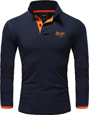 Herren Poloshirt Basic Kontrast Stickerei Kragen Langarm Polohemd T-Shirt R-0057 Navyblau/Orange 4XL