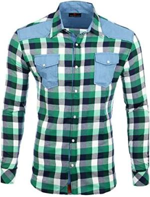 Herren Hemd Männer-Hemd Kariertes Baumwollhemd Slim Fit Karo Material-Mix Langarm Jeans RS-7202 Grün XL