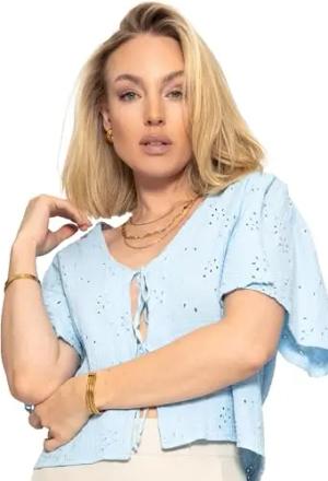 Lochstickerei Musselin Bluse mit Schleife Elegant - Kurzarmbluse zum binden - Sommer Oberteil Damen mit Schnürung - Summer vorne Schleife-Shirt - Hellbeige - Hellblau S M L