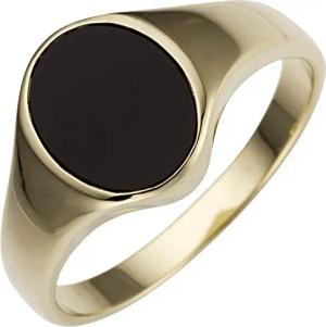 Ring aus 585 Gold Gelbgold mit Onyx schwarz oval flach Goldring Unisex, Ringgröße:Innenumfang 60mm ~ Ø19.1mm
