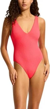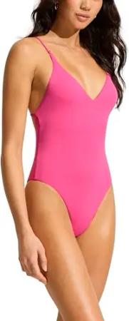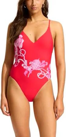 Damen Deep V Neck Over The Shoulder One Piece Swimsuit Badeanzug, Sea Dive Snapdragon, 44