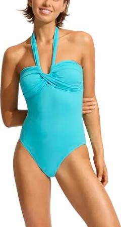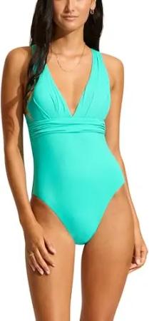 Damen-Badeanzug mit tiefem V-Ausschnitt, breiter Riemen, einteiliger Badeanzug, La Mer Aquatic Blue, 42
