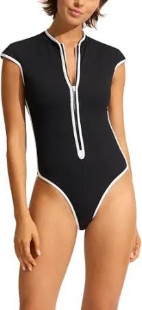 Damen Einteiler mit Flügelärmeln und Reißverschluss Vorne Badeanzug, Beach Bound Black, 38