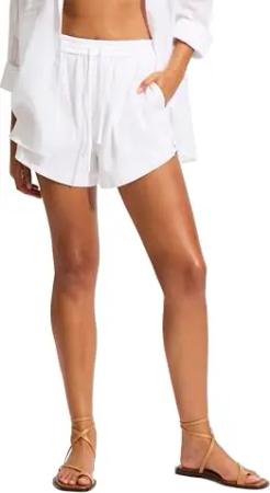 Damen Knitter-Baumwoll-Strand-Short-Coverup Überwurf für Schwimmbekleidung, Beach Edit Weiß, S