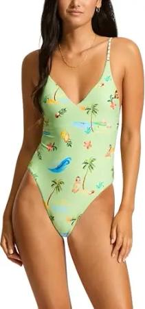 Damen V Neck One Piece with High Legline Swimsuit Badeanzug, Tropique Aloe Gel, 42