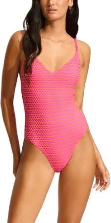 Damen V Neck One Piece with High Legline Swimsuit Badeanzug, Netz-Effekt, Hot Pink, 42