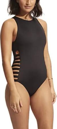 Women's Standard High Neck One Piece Swimsuit with Multi Strap Sides, Eco Collective Black, 8