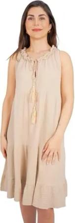Ärmelloses Damen Musselin Kleid Mini Midi 100% Baumwolle mit Tasseln, Leicht & Locker, One Size - Buki (beige)
