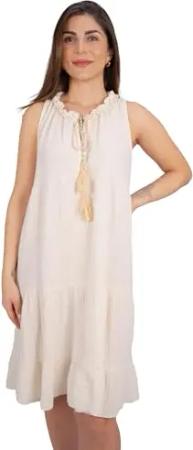 Ärmelloses Damen Musselin Kleid Mini Midi 100% Baumwolle mit Tasseln, Leicht & Locker, One Size - Buki (Creme)
