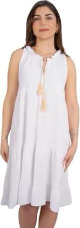 Ärmelloses Damen Musselin Kleid Mini Midi 100% Baumwolle mit Tasseln, Leicht & Locker, One Size - Buki (weiß)