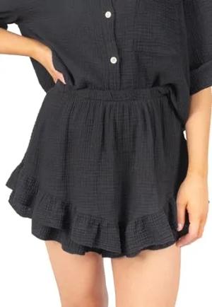 Damen Musselin Hosen Rock kurz mit Rüschen, 100% Baumwolle luftig - Lorena (Schwarz)