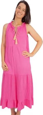 Damen Musselin Maxikleid Maxi Kleid aus 100% Baumwolle mit Tasseln, Leicht & Locker, One Size - Viola (pink)