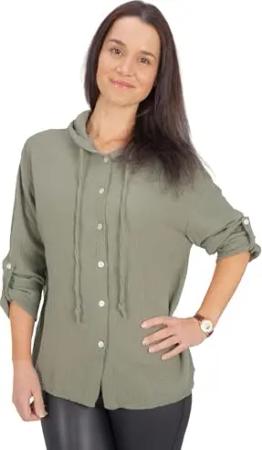 Damen Musselinbluse aus 100% Baumwolle, Oversized, Halbarm & mit Kapuze - Camila (Khaki, L/XL)
