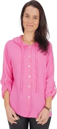 Damen Musselinbluse aus 100% Baumwolle, Oversized, Halbarm & mit Kapuze - Camila (pink, S/M)