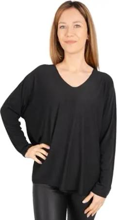 Elegantes Damen Langarm Shirt mit V-Ausschnitt | Leicht & Atmungsaktiv | Vielseitig kombinierbar | One Size - Maya (Viskose-Mischung, Schwarz)