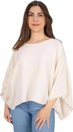 Kurze, Weite Damen Musselin Bluse, Boho, Bordüre, Oversized, One Size - Mathilda (Creme)