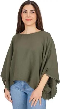 Kurze, Weite Damen Musselin Bluse, Boho, Bordüre, Oversized, One Size - Mathilda (Dark Khaki)