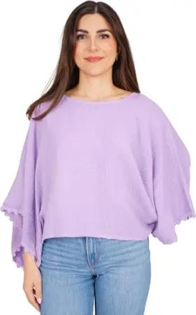 Kurze, Weite Damen Musselin Bluse, Boho, Bordüre, Oversized, One Size - Mathilda (Flieder)