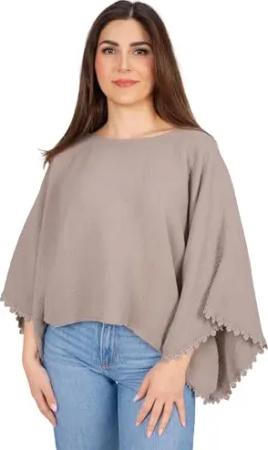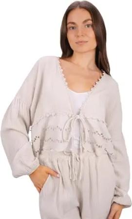 Kurze, Weite Damen Musselin Bluse, Boho, Bordüre, Oversized, One Size - Mathilda (Taupe)