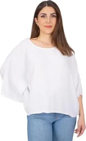 Kurze, Weite Damen Musselin Bluse, Boho, Bordüre, Oversized, One Size - Mathilda (Weiß)
