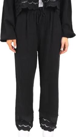 Lange & lockere Musselin Hose mit Lochstickerei und Elast. Bund - INES (Schwarz)
