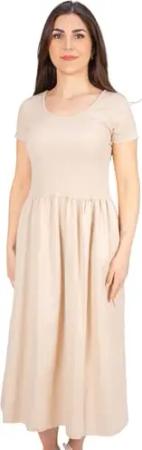 Lockeres Damen Maxi Kleid, Baumwolle, One Size, Kurze Ärmel mit Taschen - Ayda (Beige)