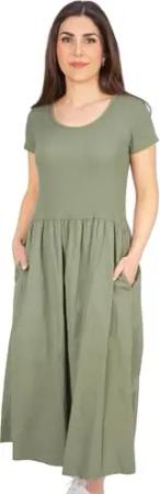 Lockeres Damen Maxi Kleid, Baumwolle, One Size, Kurze Ärmel mit Taschen - Ayda (Khaki)