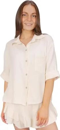 Musselin Bluse Damen aus 100% Baumwolle - kurz, luftig & locker - Frühling, Sommer mit Brusttasche - Celine (Creme S/M)