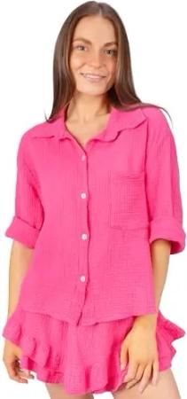 Musselin Bluse Damen aus 100% Baumwolle - kurz, luftig & locker - Frühling, Sommer mit Brusttasche - Celine (Pink L/XL)