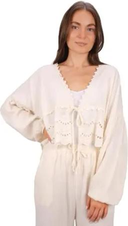 Musselin Bluse mit Bordüre zum Binden, Spitze & Bindeband – im Boho Stil Frühling/Sommer - Laura (Creme)