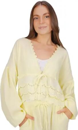 Musselin Bluse mit Bordüre zum Binden, Spitze & Bindeband – im Boho Stil Frühling/Sommer - Laura (DE/NL/SE/PL, Alphanumerisch, Einheitsgröße, Regular, Regular, Butterlemon)