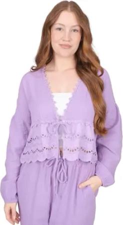 Musselin Bluse mit Bordüre zum Binden, Spitze & Bindeband – im Boho Stil Frühling/Sommer - Laura (DE/NL/SE/PL, Alphanumerisch, Einheitsgröße, Regular, Regular, Flieder)