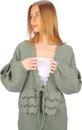 Musselin Bluse mit Bordüre zum Binden, Spitze & Bindeband – im Boho Stil Frühling/Sommer - Laura (DE/NL/SE/PL, Alphanumerisch, Einheitsgröße, Regular, Regular, Khaki)