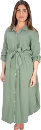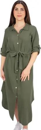 Musselin Kleid mit Knopfverschluss und Bindegürtel aus 100% Baumwolle, Leicht & Locker, One Size - Victoria (Dark Khaki)