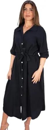Musselin Kleid mit Knopfverschluss und Bindegürtel aus 100% Baumwolle, Leicht & Locker, One Size - Victoria (Schwarz)