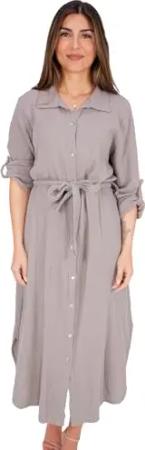 Musselin Kleid mit Knopfverschluss und Bindegürtel aus 100% Baumwolle, Leicht & Locker, One Size - Victoria (Taupe)