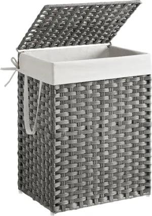 Wäschekorb, Wäschesammler 90 L, Wäschebox aus synthetischem Rattan, mit Deckel und Griffen, geflochten, faltbar, herausnehmbarer Wäschesack, taubengrau LCB51WG