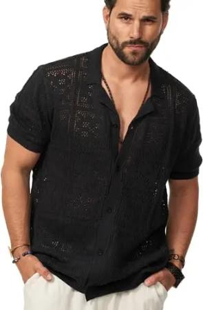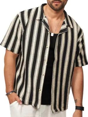 Herren Hemd Kurzarm Strick Overshirt Knit Gestreiftes Freizeithemd T-Shirt Oversize-Fit Regular-Fit Vintage Sommer-Look S2_Baloo-Black-M