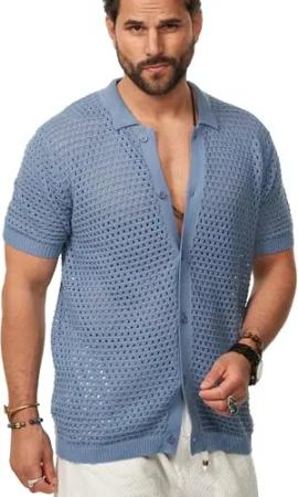 Herren Poloshirt Crochet Kurzarm Cardigan Knit Strick-Polo T-Shirt Freizeit Männer Polo-Hemd Men's Sommer-Fit S2_Balm-Blue-S