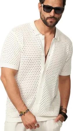 Herren Poloshirt Crochet Kurzarm Cardigan Knit Strick-Polo T-Shirt Freizeit Männer Polo-Hemd Men's Sommer-Fit S2_JITTERBURG-Ecru-L