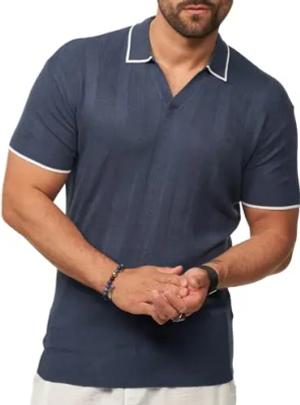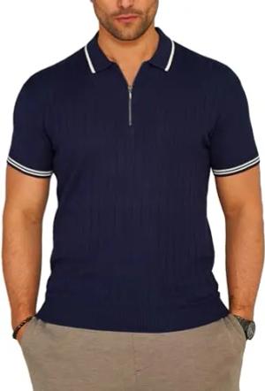 Herren Strick Poloshirt Kurzarm Gerippt T-Shirt Polo-Hemd Knit Oberteil mit Zipper-Kragen Kontraststreifen S2_KP-102-Navy-S
