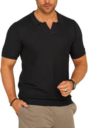 Herren Strick Poloshirt Kurzarm T-Shirt Polo-Hemd Knit Oberteil aus Baumwolle Offener Kragen S2_KP-104-Black-M