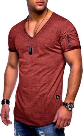 Herren T-Shirt V-Ausschnitt Kurzarm Oversized Basic Zipper Male Tee aus Baumwolle Leichtes V-Neck Oberteil Weinrot-Wash-L