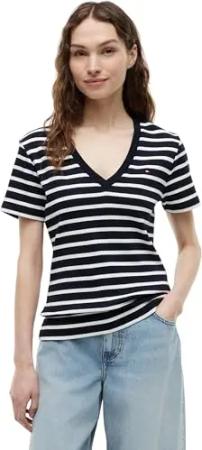Damen T-Shirt Kurzarm New Slim Cody mit V-Ausschnitt, Mehrfarbig (Nos Breton Desert Sky/Ecru), XS